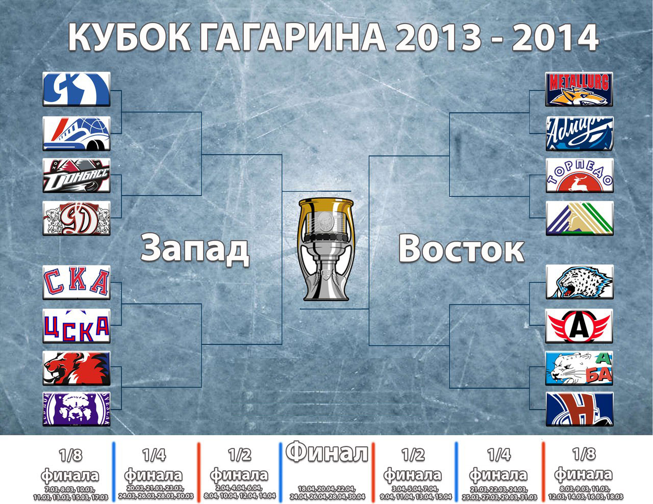 4 марта 2014 года в Континентальной хоккейной лиге (КХЛ) завершился регулярный сезон по итогам которого сформировалась сетка плей-офф Кубка Гагарина борьбу за который продолжают 16 клубов - "Динамо" (Москва), "Локомотив" (Ярославль), СКА (Санкт-Петербург), ЦСКА (Москва), "Лев" (Прага) "Медвешчак" (Загреб), "Донбасс" (Донецк), "Динамо" (Рига), "Металлург" (Магнитогорск), "Адмирал" (Владивосток), "Барыс" (Астана), "Автомобилист" (Екатеринбург), "Ак Барс" (Казань), "Сибирь" (Новосибирск), "Салават Юлаев" (Уфа), "Торпедо" (Нижний Новгород).