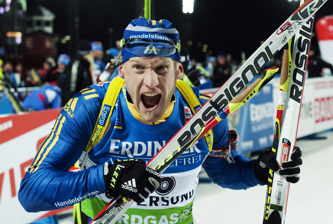 К радости местных болельщиков гонку выиграл швед Карл-Йохан Бергманн (на фото), который на 7 секунд опередил обладателя Кубка мира прошлого сезона - норвежца Тарье Бё. Норвежец Эмил-Хегле Свендсен и француз Мартен Фуркад по скорости были лучшими, но каждый из них совершил по одному промаху, что не позволило бороться за победу. Отлично смотрелся и великий Оле-Эйнар Бьорндален, который допустил один промах и финишировал 9-м, проиграв победителю 49 секунд.