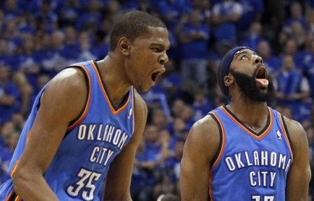 Баскетболисты "Оклахомы" в 1/8 финала плей-офф со счетом 4:3 обыграли "Мемфис", а "Индиана" с таким же счетом одолела "Атланту". "Оклахома-Сити Тандер" одержала победу над "Мемфис Гриззлис" со счетом 120:109 (27:36, 34:22, 33:23, 26:28) в решающем седьмом матче серии. В составе "Тандер" трипл-дабл сделал Расселл Уэстбрук - 27 очков, 16 передач и 10 подборов. Его одноклубник Кевин Дюрант (на фото слева) отметился 33 очками и 8 подборами. У "Гриззлис" 24 балла набрал испанец Марк Газоль. В четвертьфинале плей-офф "Тандер" сыграют с "Лос-Анджелес Клипперс", который в седьмом матче победил "Голден Стэйт Уорриорз" - 126:121.