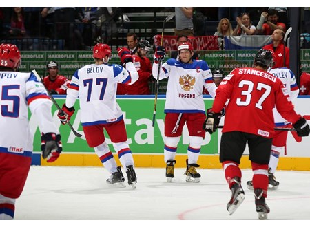 Россияне начала матч с командой Швейцарии очень удачно. Уже к первому перерыву в ворота серебряных призёров прошлого сезона было забито три безответных гола. Первая же атака в первом матче 78-го чемпионата мира стала результативной. Денис Денисов точным броском вывел шайбу из своей зоны, Вадим Шипачёв в одно касание пробросил её вдоль синей линии и Сергей Плотников великолепным броском в дальний угол прошлогодних серебряных призёров уже на 13-й секунде игры вывел сборную России вперёд, забив свой первый гол на чемпионатах мира.