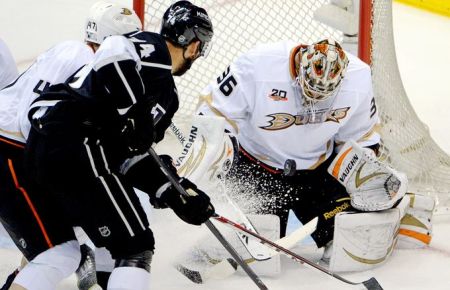 7-го апреля он провел дебютный матч в регулярном чемпионате НХЛ, отстояв "на ноль" во встрече с "Ванкувер Кэнакс", став самым молодым вратарем, сделавшим шат-аут, за последние 29 лет. В "регулярке" он провел только три матча и во всех "Утки Анахайма" одержали победы. 10-го мая Джон Гибсон (на фото) провел первый матч плей-офф Кубка Стэнли против "Королей Лос-Анджелеса" и, отразив все 28 бросков, был признан первой звездой встречи. "Утки" выиграли со счетом 2:0 и сравняли счет в серии - 2:2.