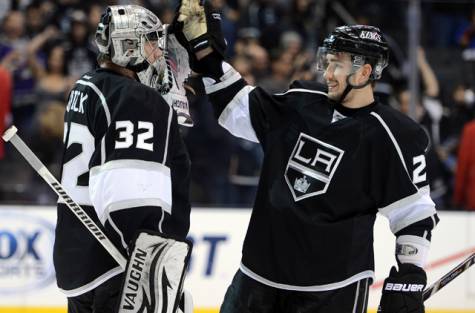 "Короли" уже в первом периоде смяли оборону "Уток", трижды поразив ворота Джона Гибсона. Сначала Джастин Уильямс с передачи Славы Войнова (на фото справа) реализовал численное большинство, а затем Джефф Картер и Майк Ричардс отличились в равных составах. Соотношение бросков было 16:6 в пользу гостей из Лос-Анджелеса. Только на 23-й минуте, когда лучший бомбардир плей-офф Анже Копитар довел счет до 4:0, Будро заменил Гибсона, отправив на площадку Йонаса Хиллера, но было уже поздно.
