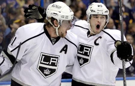 Этот матч стал настоящим испытанием для "Кингз". Уже к 9-й минуте "Ястребы" вели в счете 2:0 после голов Брэндона Саада и Джонатана Тэйвза. На 17-й минуте Джефф Картер с передачи капитана "Королей" Дастина Брауна (на фото справа) сократил отставание в счете, а еще через 51 секунду Джастин Уильямс с передачи Славы Войнова сравнял счет - 2:2.