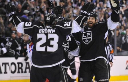 Основное время второго матча вновь завершилось вничью, а в первом овертайме "Рейнджеры" даже смогли перехватить инициативу, заставив наставника "Королей" Деррила Саттера взять тайм-аут на 66-й минуте игры. Хорошие моменты решить исход встречи были у обеих команд, но вновь больше повезло хозяевам. На 11-й минуте второго овертайма капитан "Кингз" Дастин Браун подставил клюшку под бросок Уилли Митчелла, отправив "Рейнджерс" в нокдаун - 5:4 в матче и 2:0 в серии.