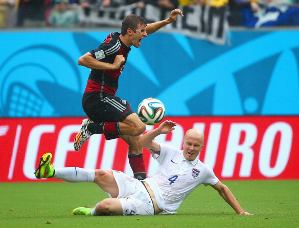 После перерыва натиск немцев продолжился и на 55-й минуте активность привела к успеху. После подачи Озила в штрафную, Пер Мертезаккер головой послал мяч в левый угол, но Ховард в отчаянном прыжке смог отбить удар. Мяч отлетел к линии штрафной, где его ждал Томас Мюллер (на фото слева), обводящим ударом направив его в правый угол. Ховард вновь метнулся за мячом, но удар был просто филигранным - 1:0!