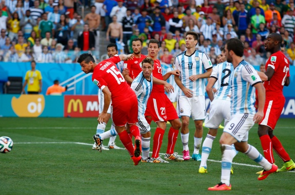 На 28-й минуте полузащитник швейцарцев Гранит Джака после розыгрыша углового мощно пробил с 10-и метров, но вратарь аргентицев ногой успел отбить мяч. Самый явный голевой момент спустя 10 минут получил форвард сборной Швейцарии Йосип Рдмич. Жердан Шакири выиграл борьбу за мяч в центре поля и отправил Рдмича на рандеву с голкипером. Рдмич вошел в штрафную и попытался перебросить мяч через вратаря, но удар не получился и мяч прилетел точно в руки Серхио Ромеро.