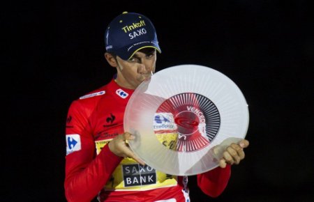 Капитан российской велокоманды "Tinkoff-Saxo" Альберто Контадор (на фото) выиграл домашнюю для него "Вуэльту" в общем зачете, а российская "Катюша" первенствовала в командном. Контадор победил на нынешней "Вуэльте" с отрывом в 1 минуту 10 секунд от ближайшего преследователя британца Криса Фрума ("Sky"). Третьим стал испанец Алехандро Вальверде ("Movistar", +1.50).