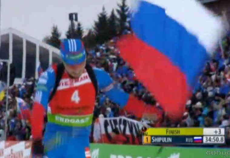 К последнему заходу на стрельбище тройка лидеров в составе двух французов и россиянина пришла практически одновременно. И тут великолепно отработал Шипулин, который безукоризненно провел стрельбу и, воспользовавшись промахами соперников, ушел на последний круг дистанции на 16,8 секунд раньше Мартен Фуркада. Остальные соперники были уже больше чем в 40 секундах от лидера. Француз сумел немного сократить разрыв, но лишить Антона Шипулина, который закончил гонку с российским флагом в руках (на фото), первого места он не смог.