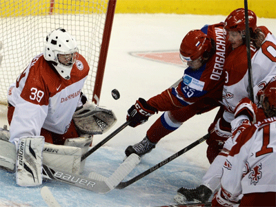 Почти половину матча россияне, значительно перебросавшие соперников (40-26), не могли найти пути к их воротам, но всё-таки усилиями Николая Голдобина, который на последней минуте второй 20-минутки с отрицательного угла оставил не у дел голкипера скандинавов Георга Сёренсена, сократили отставание до минимума. Сравнялся же счёт на 48-й минуте, когда шайба после броска Александра Шарова попала в конёк Максима Мамина и отскочила в ворота. Воспользовавшийся видеопросмотром арбитр матча немец Ларс Брюггеманн гол засчитал.