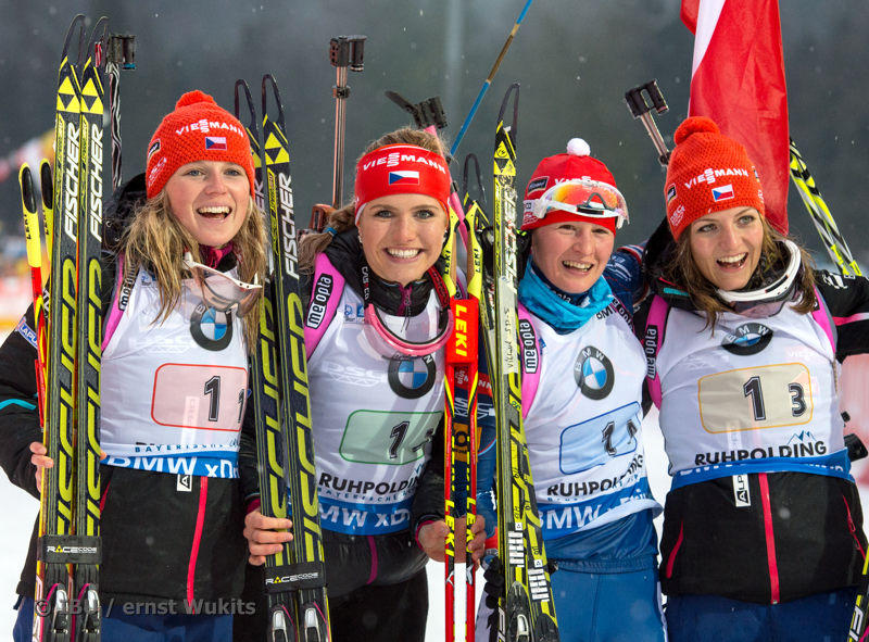 Вслед за триумфом в Оберхоффе, где они завоевали эстафетное "золото" после более чем 15-летнего перерыва, чешская четвёрка в том же составе - Ева Пускарчикова, Габриэла Соукалова, Йитка Ландова и Вероника Виткова, преодолела за 1 час 20 минут 40,1 секунды дистанцию в Рупольдинге и вновь стала лучшей, допустив на этот раз девять промахов при оберхоффских семи.