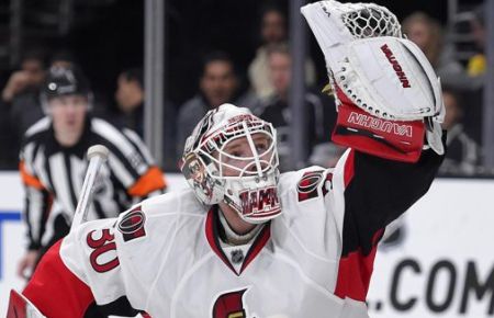 Главная вратарская сенсация регулярного чемпионата, 27-летний канадский голкипер "Сенаторов Оттавы" Эндрю Хэммонд (на фото), который уже переписал все рекорды клуба для киперов-дебютантов, одержал еще одну победу, отразив во встрече с "Нью-Йорк Айлендерс" 34 броска и став первой звездой матча.