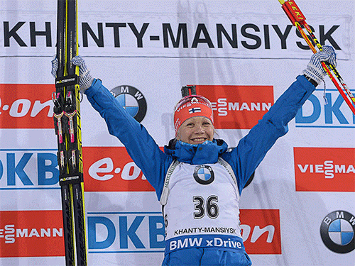Финка преодолела шестикилометровую дистанцию с одним промахом на двух огневых рубежах за 19 минут 49,1 секунды, опередив показавшую второе время немку Лауру Дальмайер на 14,2 секунды. Третий результат показала сохранившая за собой лидерство в общем зачёте Кубка мира белоруска Дарья Домрачева с двумя промахами уступившая победительнице 15,5 секунд.