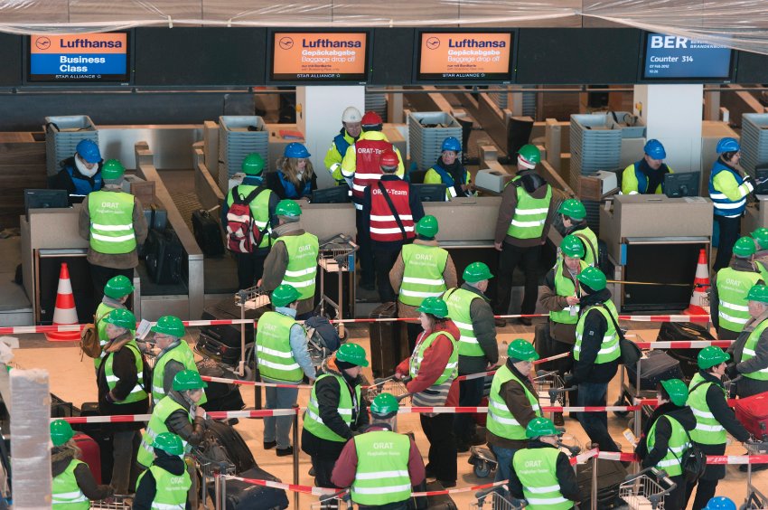Руководство нового берлинского аэропорта имени Вилли Брандта, помня о хаосе, который творился в первые дни открытия Терминала 5 в лондонском Хитроу, решило предотвратить подобную ситуацию в Берлине. Пока «испытателям» не разрешают снимать каски: все-таки аэропорт еще больше похож на строительную площадку, багажные тележки курсируют мимо рабочих и строительных лесов.