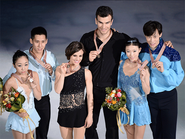 На фото: Пьедестал почёт в соревнованиях спортивных пар ЧМ-2015, слева направо: Суй Вэньцзин и Хань Цун (Китай, серебро), Меган Дюамель и Эрик Редфорд (Канада, золото), Пан Цин и Тун Цзянь (Китай, бронза).