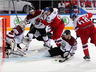 Сборная Латвии, несмотря на то, что лишь 10 раз бросила по воротам чехов, дважды выходила вперёд. Однако команда хозяев в 3,5 раза перебросавшая соперников, смогла вырвать победу со счётом 4:2. Автором третьего гола чехов (см.видео), который стал победным в этом матче, стал 43-летний Яромир Ягр, отдавший хоккею уже четверть века.