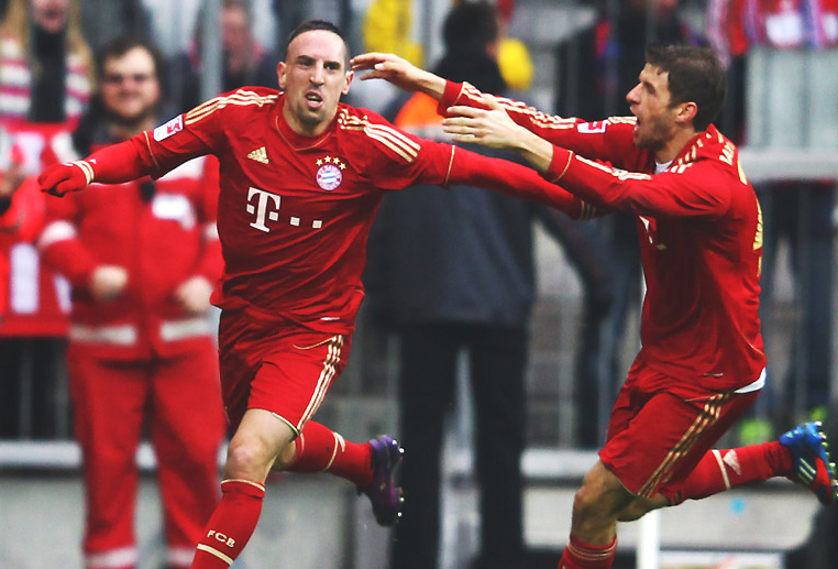 Оба лидера играли в воскресенье. Первыми на поле стадиона в Мюнхене вышли «Бавария» и «Шальке». С первых минут мюнхенцы показали, что в этот день они настроены серьезно. Роббен показывал, пожалуй, лучшую свою игру после зимнего перерыва, активность проявлял Рибери, да и вся команда казалось забыла обидное поражение, которое потерпела несколько дней назад в Базеле. Полчаса защита гостей держалась, а на 36-й минуте «Бавария» забила. Рибери вышел один на один с вратарём гостей Хильдебрандом, в изящном прыжке перекинул мяч через него и, избежав столкновения, забивал уже в пустые ворота. Гельзенкирхенцы до перерыва могли получить ещё минимум два мяча в свои ворота, но на 40-й минуте потрясающий сэйв Хильдебранда, который не позволил Мюллеру забить с трёх метров, а Бадштубер, достав в том же эпизоде до мяча, каким-то образом отправил его не за линию ворот, а вдоль неё. Завершился же тайм мощным выстрелом Фухса метров с тридцати, который не привёл к голу только благодаря мастерству вратаря «Баварии» Нойера. Во втором тайме игра шла уже на встречных курсах. Игроки «Шальке» уже совсем забыли, что они играют на поле великой «Баварии» и начали раз за разом угрожать воротам хозяев. Однако итоговый счёт в матче установил всё тот же Рибери. Он прошел по правому флангу, отыгрался с Мюллером возле чужой штрафной и отличным ударом оформил дубль.