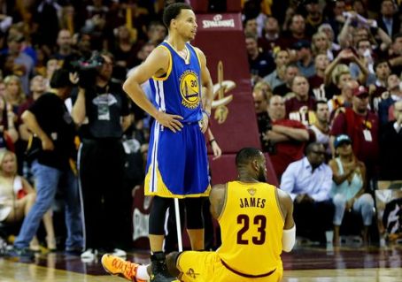 30-летний Леброн Джеймс (на фото сидит) набрал только 20 очков (до этого у него был средний показатель результативности в финале - 41 очко за игру), а Стивен Карри (на фото стоит) ограничился 22 очками, но отдал несколько великолепных результативных передач и четыре раза поразил кольцо "Кливленда" из-за трехочковой дуги. Именно дальние попадания стали ключом к победе "Голден Стэйт". "Воины" 30 раз атаковали издали и 12 бросков достигли цели (40%), а "Кавалеры" из 27 попыток смогли реализовать только 4 (14,8%)!