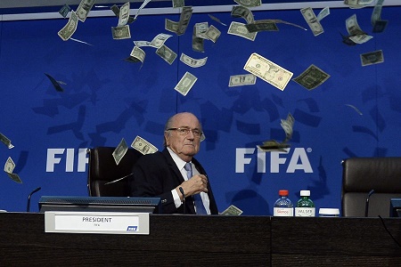 В Цюрихе перед началом пресс-конференции комик Ли Нельсон бросил пачку денег в президента ФИФА Йозефа Блаттера. Из-за хулиганской выходки мероприятие пришлось отложить.